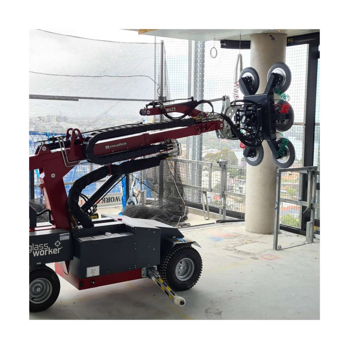 Mieten Sie sich die perfekte Unterstützung für die Montage. Unser neuer Uplifter Glassworker GW625-2 High Lifter mit einer Tragkraft bis 625 kg steht in Kürze zur Verfügung. Dank seiner Breite von nur 83 cm passt dieser Glasmontagekran auch durch enge Flure, Türen und Türöffnungen und kann dabei vertikale Montagen bis zu 3,6 m und bis zu 4,2 m über Kopf durchführen. Die perfekt abgestimmte stufenlose Antriebseinheit mit dreidimensionaler Steuerungstechnik, einer individuell konfigurierbaren Vakuumsauganlage und eine zusätzliche Funkfernsteuerung sind Ausstattungsdetails, die für sich sprechen.