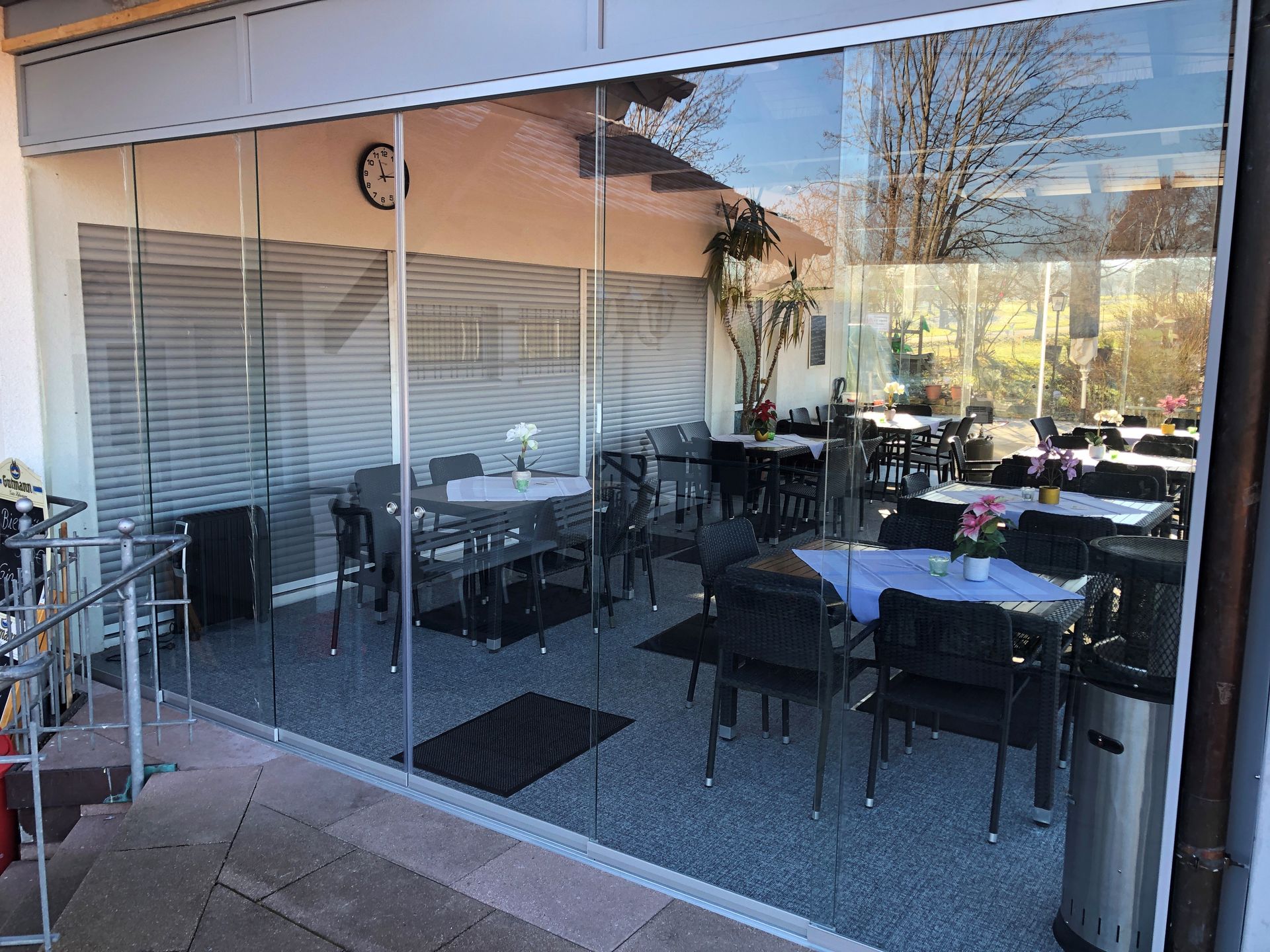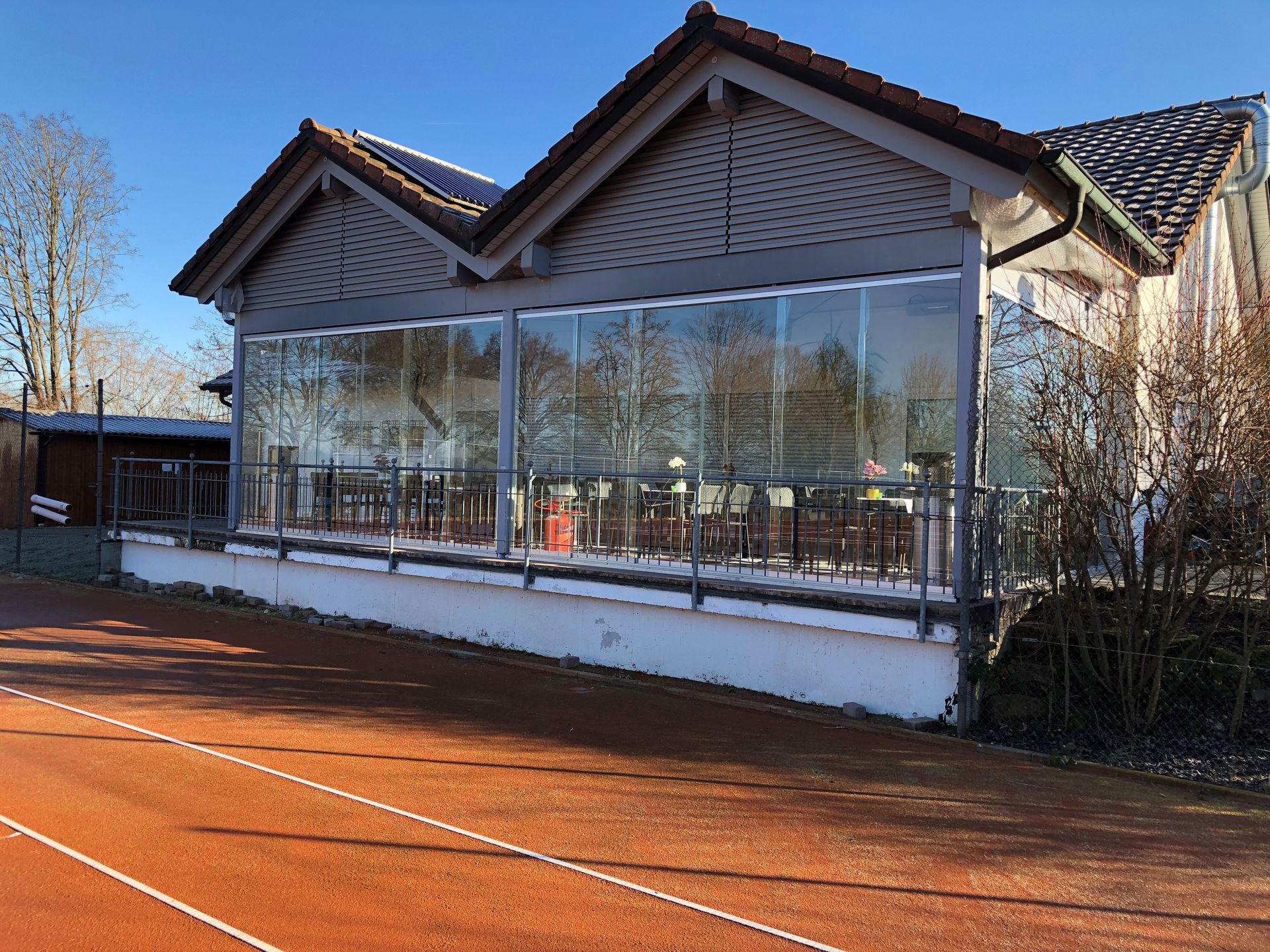 Zur Vergrößerung des Außengastronomie-Bereichs hat er das System Motion 1000 verwendet und so den Gästen die Möglichkeit gegeben, auch bei weniger schönem Wetter noch den Außenbereich gemütlich zu nutzen.Durch die Vergrößerung des Außenbereichs, welcher durch Glas wind- und regengeschützt wurde, kann man das Geschehen auf dem Tennisplatz besser verfolgen.