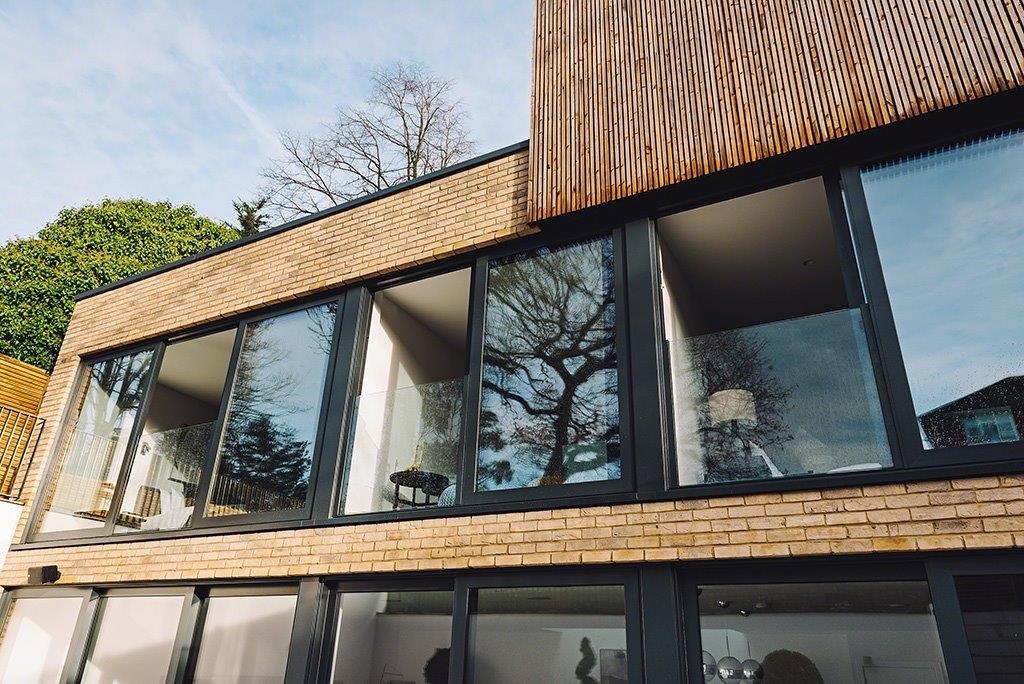 Die Glasfüllung wird mit nur zwei schlanken, vertikal angebrachten Aluminiumprofilen fixiert.