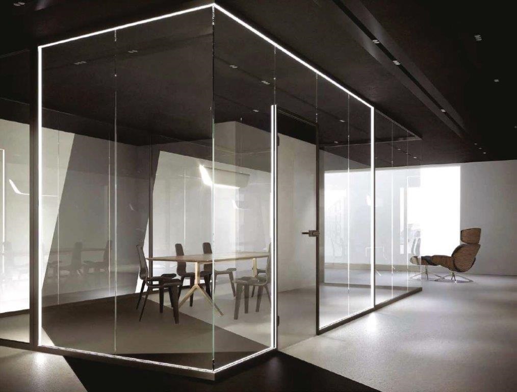 Für hohe Anforderungen an den Schallschutz gibt es darüber hinaus Rahmenprofile für eine doppelwandige Ausführung. In der Variante X-LIGHT ist die Raumtrennwand mit einer integrierten LED-Beleuchtung ausgestattet.